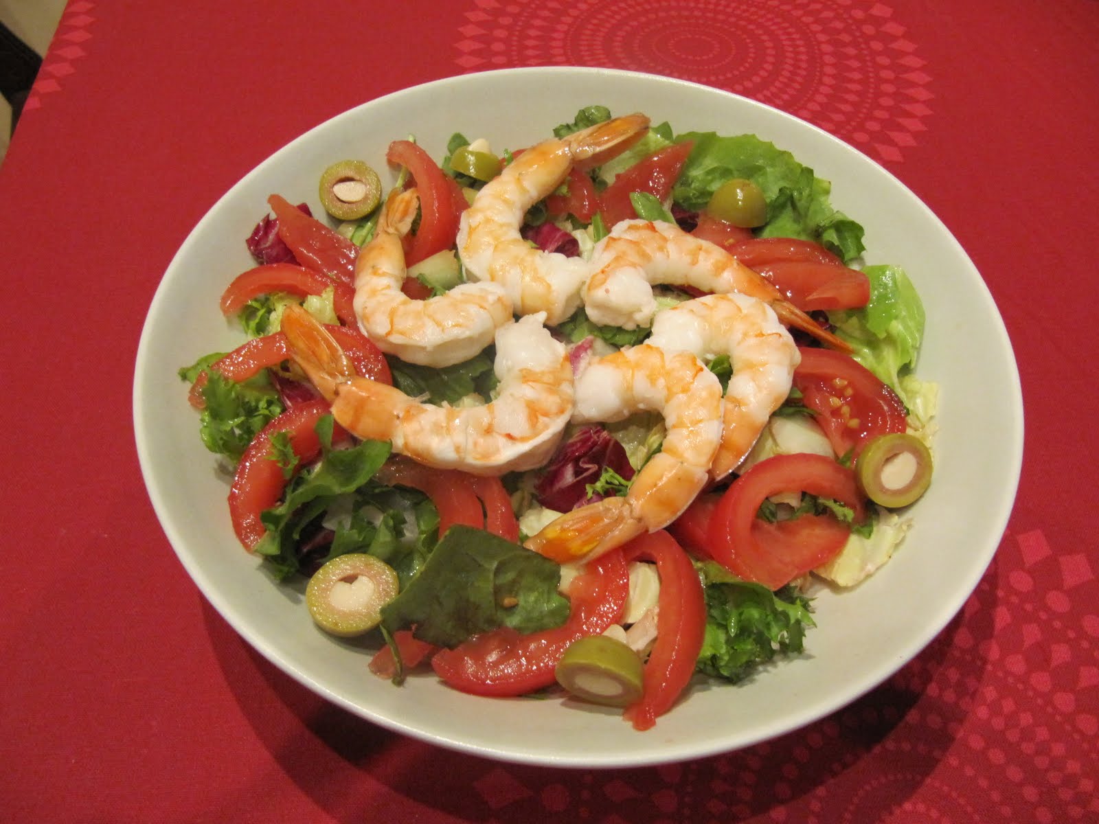 sałata mieszana, pomidor, krewetki i oliwki z migdałami…